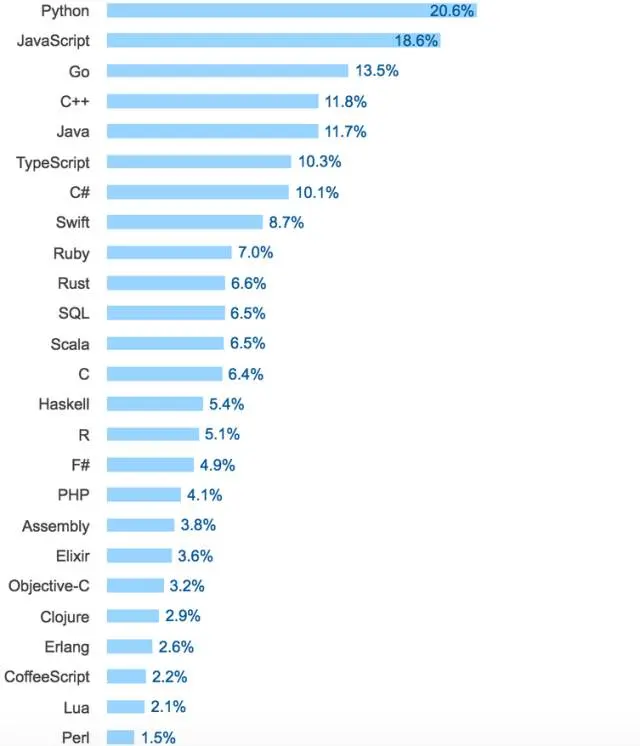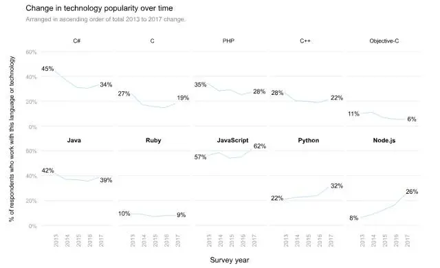 可以看到,Python 和 Node.js 等语言日益普及,而 C#和 C 语言的使用却在减少。
