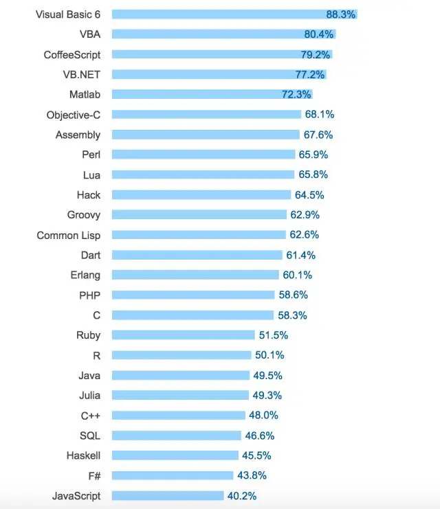 Visual Basic 连续两年被评为最可怕的语言。最可怕的意思是,目前使用该技术的开发人员比例很高,表示没有兴趣继续做下去。