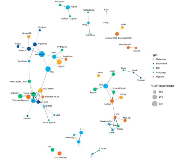 技术被集中在几个不同的“生态系统”中:下图的左侧,一个是代表 Web 开发的大型集群(中心是 JavaScript ),一个是用微软技术群(以 C#和 Visual Studio 为中心)。右边,有一个连接着 Java、Android 和 iOS 的集群“星座”。