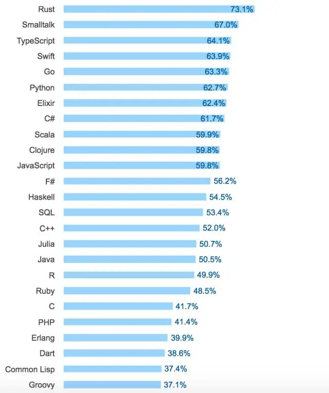 Rust 连续两年成为最受欢迎的编程语言。Swift 去年排名第二,今年降至第四名。