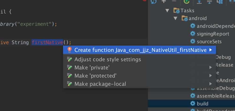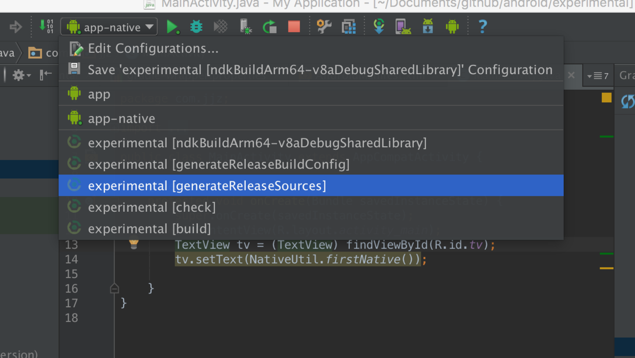 app以外,多出了一个app-native的菜单,这个选项可以直接编译NDK源码之后再运行Android,这样编写完NDK之后可以运行了,不需要再进行ndk-build:在Java中调用