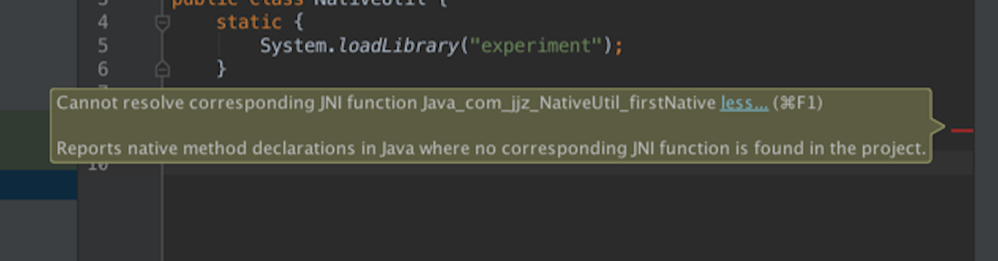 }这个时候编译器会出现一个红色的警告,因为定义的native方法编译器并没有找到对应的实现: