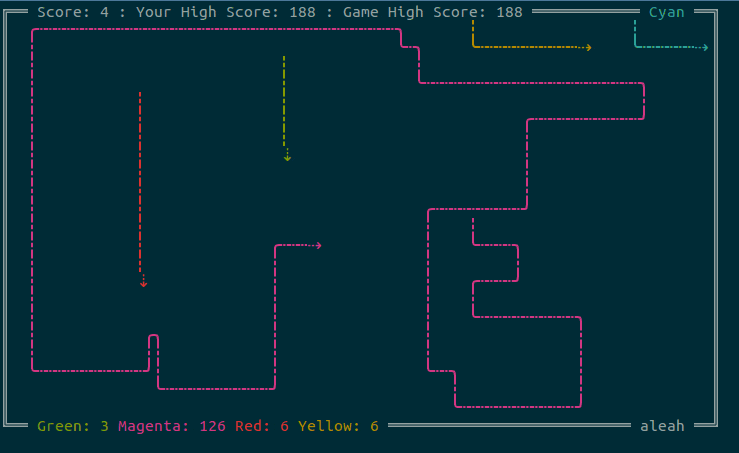 4、sshtron:sshtron 是通过 SSH 运行的多人贪吃蛇游戏,命令行输入:ssh sshtron.zachlatta.com,无需安装等待几秒即可进行游戏(因为服务器在国外,很卡
