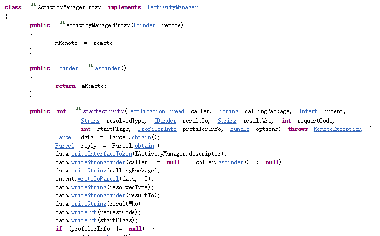 通过查看源码可以看到启动Activity的时候,是通过ActivityManagerNative类里面的ActivityManagerProxy类来启动Activity的,我们只要在这里动点手脚就可以了。