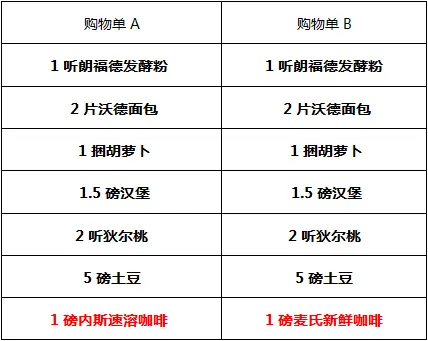 后来,心理学家梅森·海尔利用角色扮演法的投射原理,设计了两张各写有7中商品的购物单,其他6种商品都一样,唯一的差别就是一张写有速溶咖啡另一张则是新鲜咖啡: