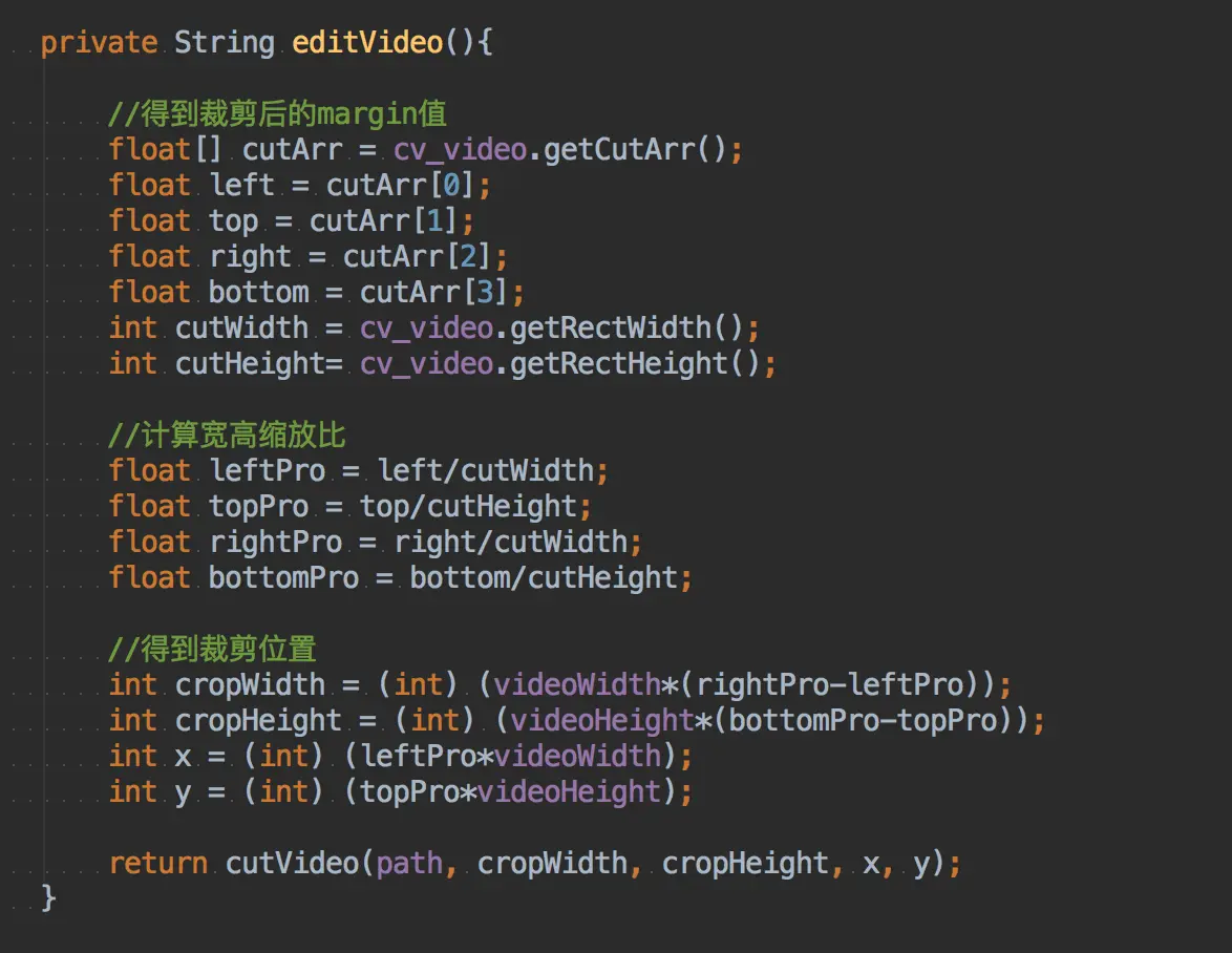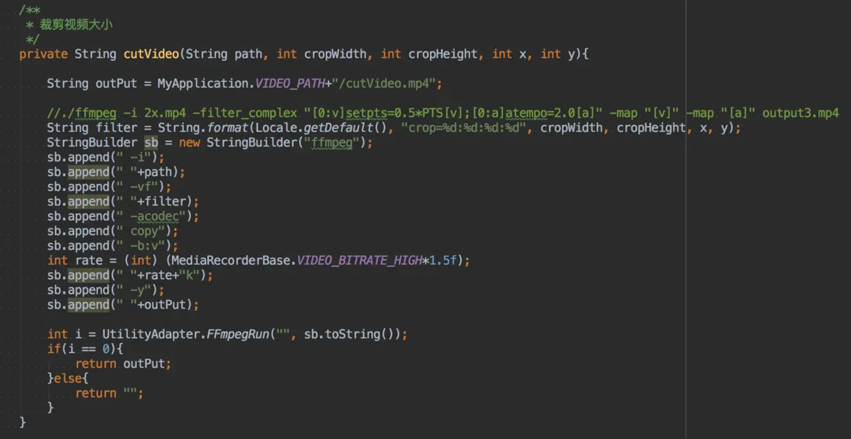 这里说下几个参数, x和y是裁剪坐标的起点, cropHeight和cropWidth是想要裁剪的长宽, 这里要注意, x+cropWidth要<=原视频宽, y+cropHeight要<=原视频高, 否者执行会失败, rate是视频的码率, 这里建议的是原码率的1.5倍, 这样视频质量不会改变很大.