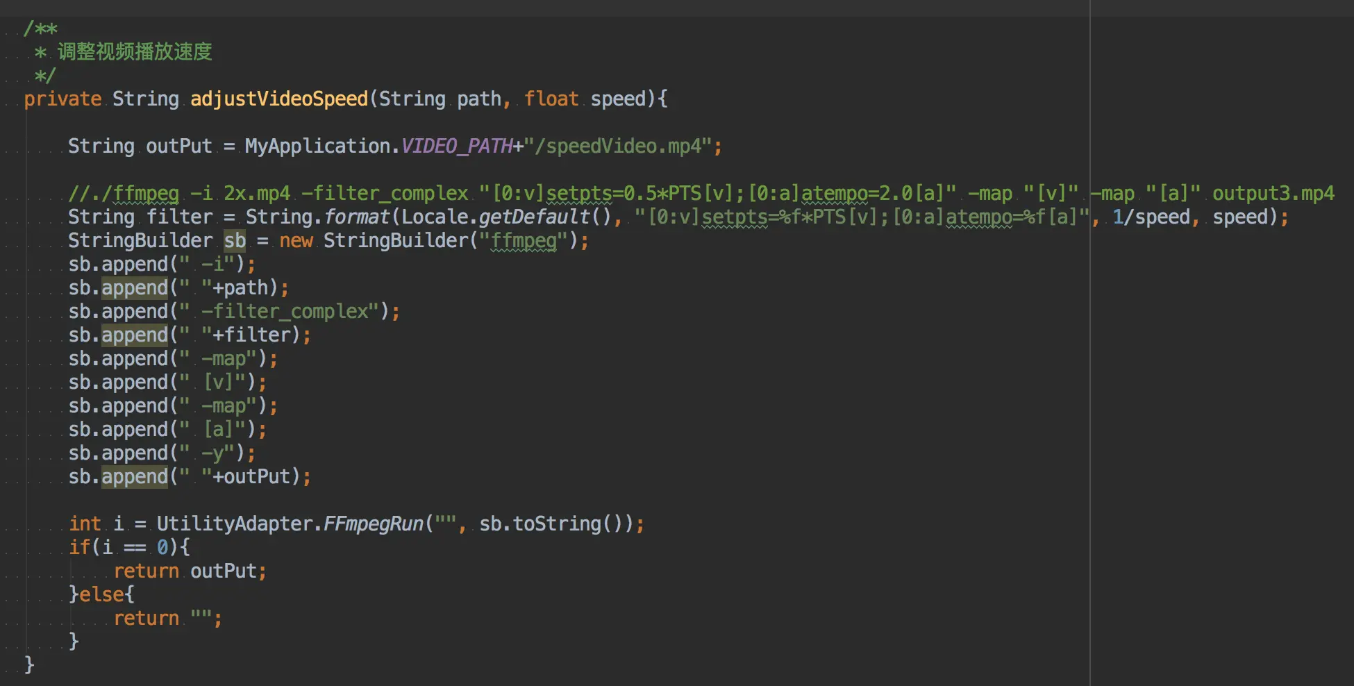 同样简单, 执行ffmpeg语句, 传入源视频目录, 和调整的视频倍速, 但是需要注意的是, 最小视频倍数为0.5(减速一倍播放), 最大为2(加速1倍播放), 当超出范围后, 就会编译失败, 返回值i=1.