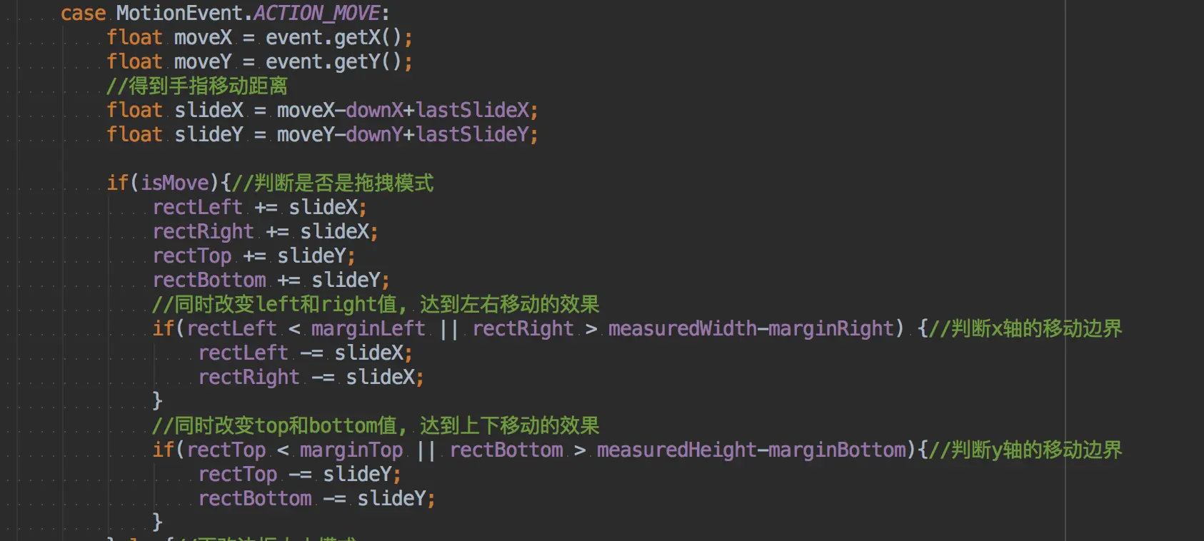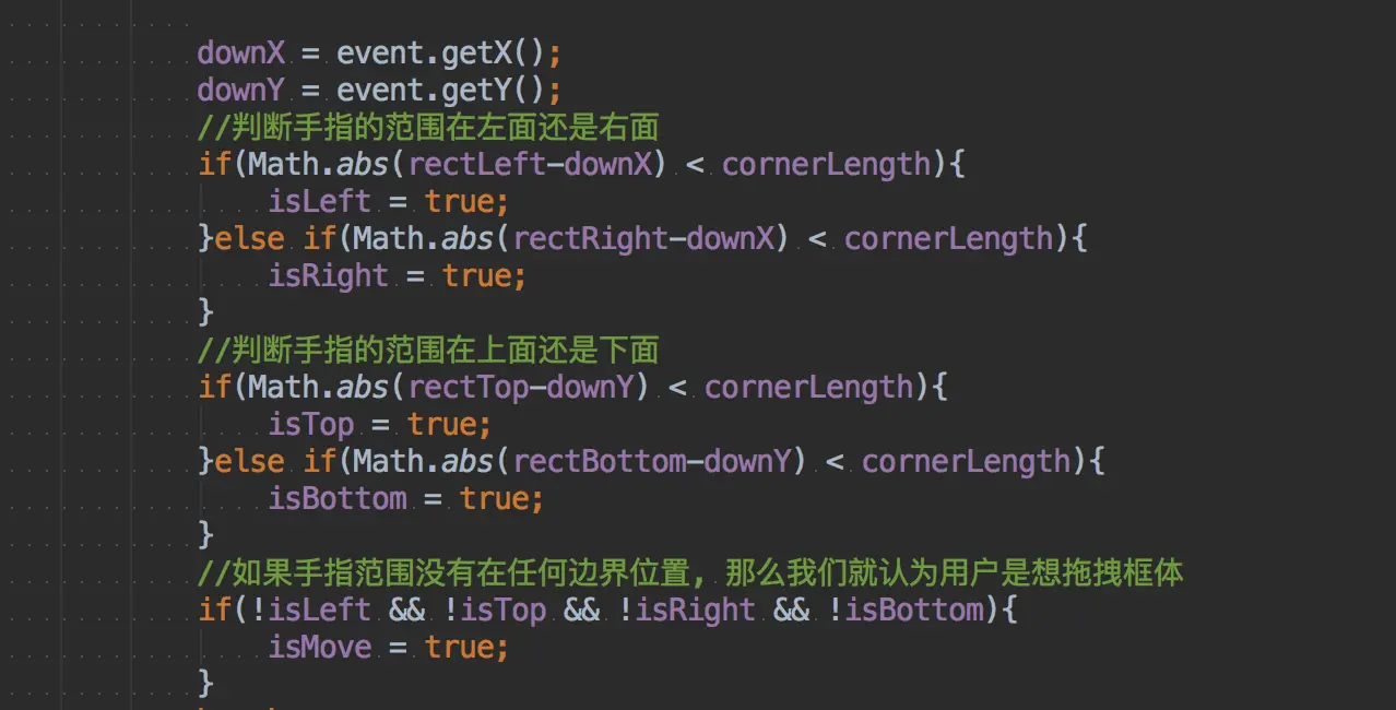 接下来是最重要的onTouchEvent事件, 手指按下的时候,检测手指位置, 判断是缩放框体还是拖拽框体: