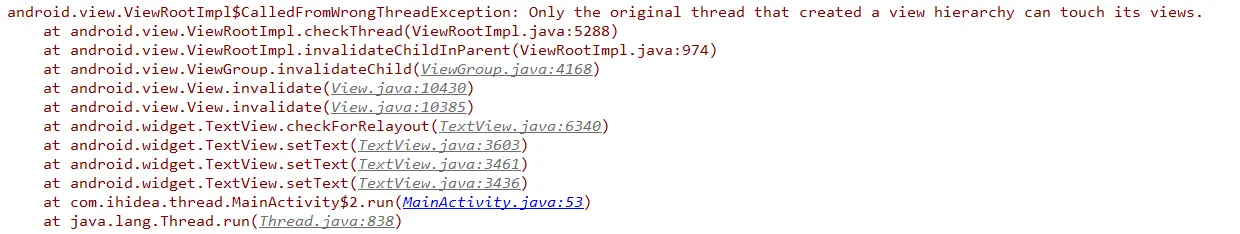 android.view.ViewRootImpl$CalledFromWrongThreadException: Only the original thread that created a view hierarchy can touch its views.第一句显示说明异常出现的原因:只有主线程才能进行更新UI操作。接下来一句: