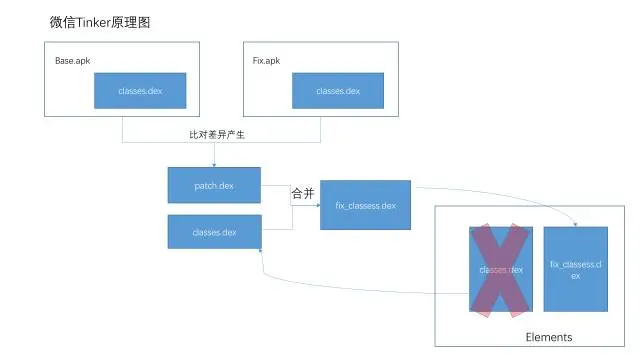 微信针对QQ空间超级补丁技术的不足提出了一个提供DEX差量包,整体替换DEX的方案。主要的原理是与QQ空间超级补丁技术基本相同,区别在于不再将patch.dex增加到elements数组中,而是差量的方式给出patch.dex,然后将patch.dex与应用的classes.dex合并,然后整体替换掉旧的DEX,达到修复的目的。