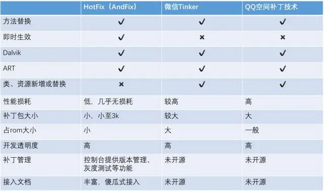 QQ空间超级补丁技术和微信Tinker提供了更加强大的功能,但是对应用的性能和稳定有较大的影响,就BUG修复的这个使用场景上还不够明确,并且显得过重。