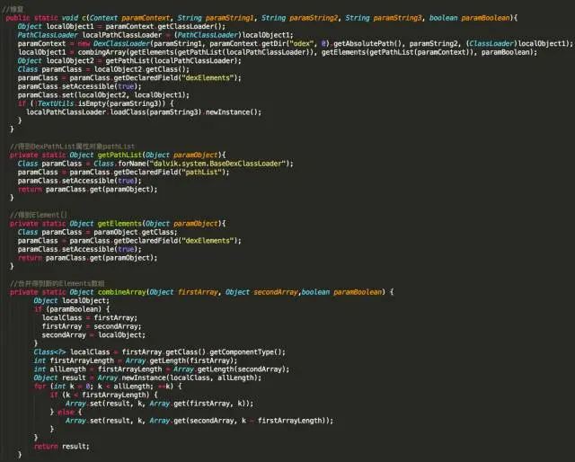 从loadPatchDex()方法进入,经过几次跳转,到达核心的代码段,SystemClassLoaderInjector.c()。由于进行了混淆和多次方法的跳转,于是将核心代码段做了如下整理: