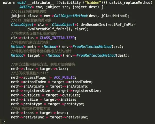 对于实现方法的替换,需要在Native层操作,经过三个步骤: