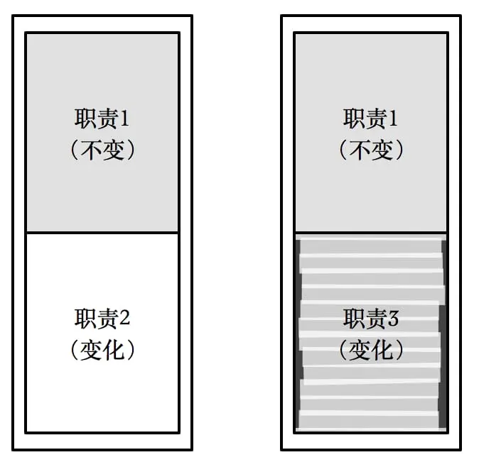 如下图所示,两个模块存在着部分重复。站在系统的角度看,它们之间存在着不变的部分(即重复的部分);也存在变化的部分(即差异的部分)。这意味着这两个模块都存在两个变化原因。