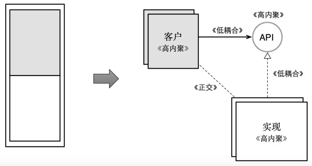 这幅图揭示了模块化设计的全部:首先将一个低内聚的模块首先拆分为多个高内聚的模块;然后再考虑这多个模块之间的API设计,以降低这些高内聚的软件单元之间的耦合度。