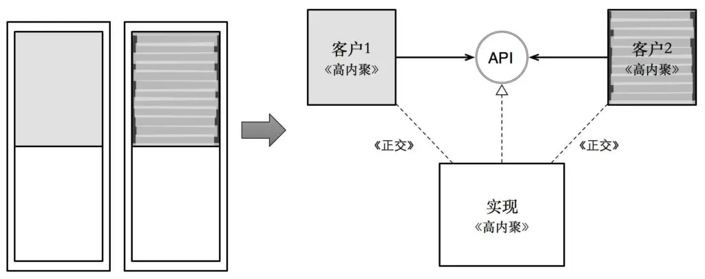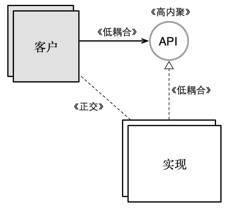 而这幅图的右侧,正是我们模块化的目标。它描述了永恒的三方关系:客户,API,实现,以及它们之间的关系。这个三方关系图清晰的指出了我们应该关注的内聚性,耦合性,以及正交性都发生在何处。