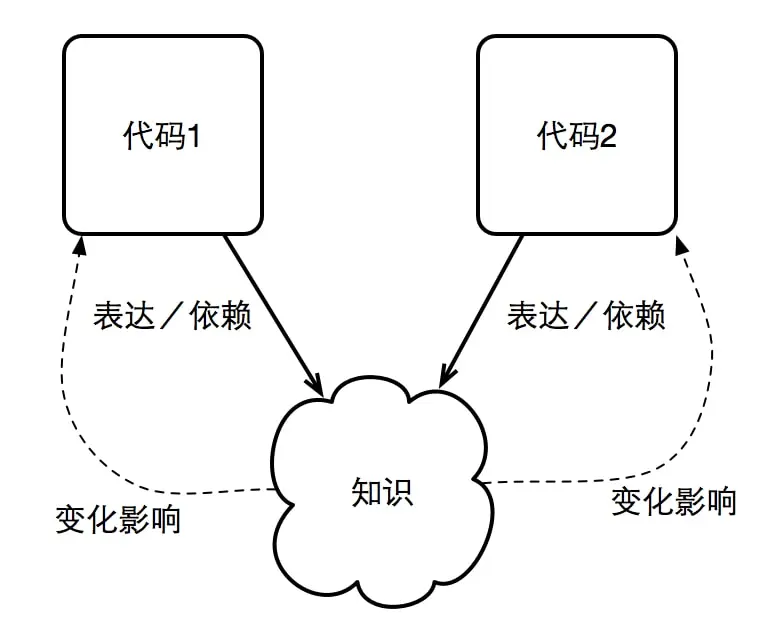 而更为糟糕的是,本质重复的代码,其实都在表达(即依赖)同一项知识。如果它们表达(即依赖)的知识发生了变化,这些重复的代码统统都要修改。因而, 重复代码也意味着高耦合。