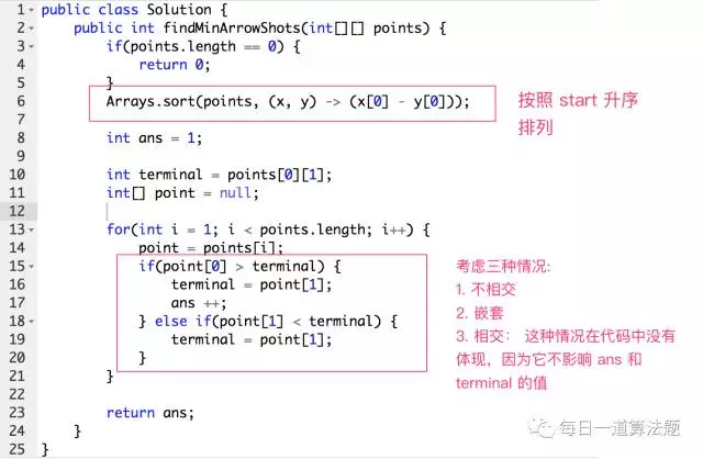 旁白:只要我们朝相交区间的任意一点射箭,就能用最少的箭刺破所有的气球。