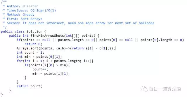题目大意是沿水平直线放 n 个热气球,其大小可用区间(x,y) 表示,热气球可以重叠,然后从 正上方(垂直方向)放箭可刺破气球。问可用最少多少支箭可刺破所有的气球。