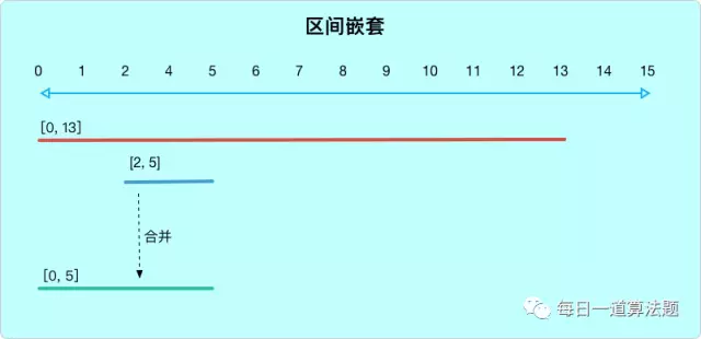 如图一所示,区间 [0, 13] 和 [2, 5] 合并后,区间大小变成了 [0, 5] 。