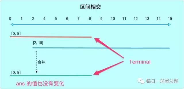如图二所示,区间[0,8] 和 [2, 15] 合并后,区间大小变成了[0, 8], terminal 的值是 8。