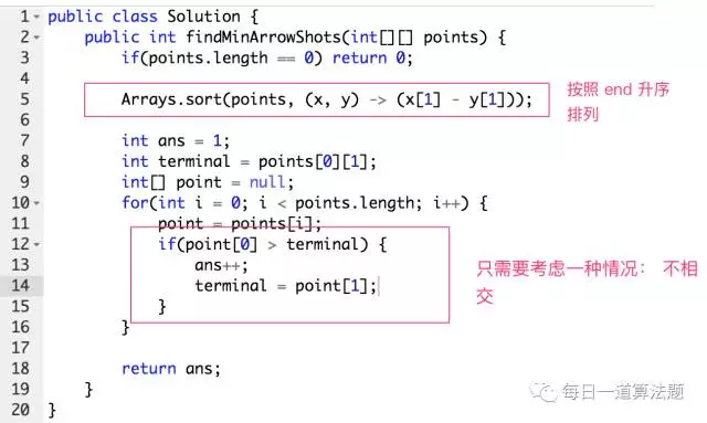 下一个区间的 start 的值大于 terminal,那么 ans 一定要加 1, 也就是要多射一次箭