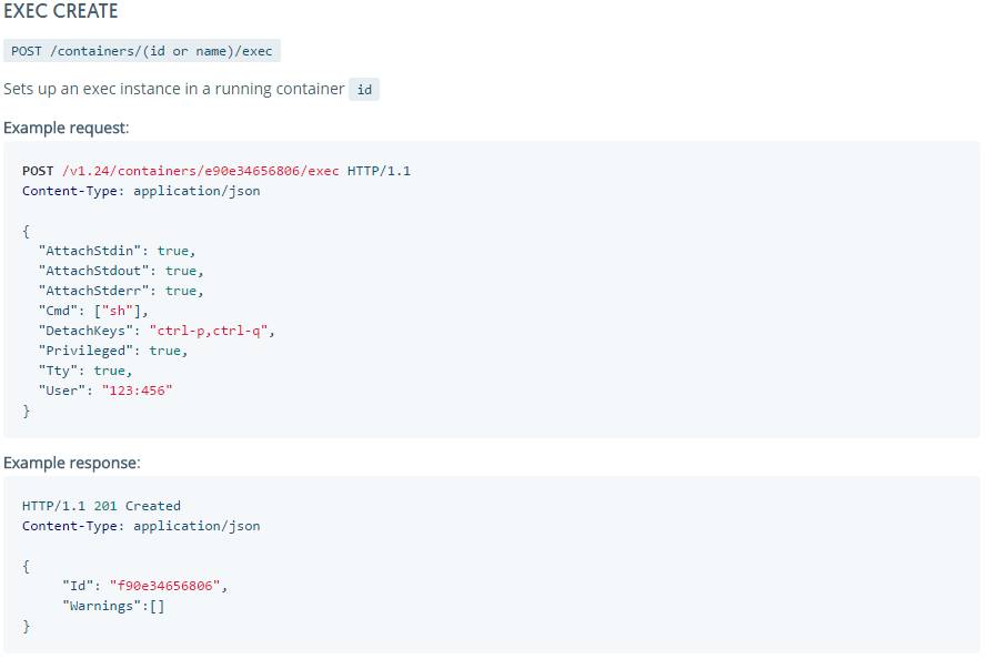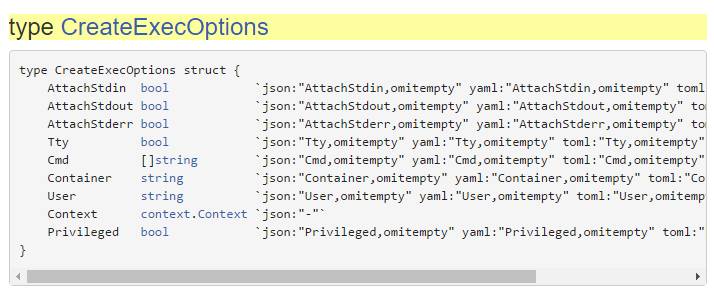 和 docker exec 相关的 API 有两个,第一个是下图中的 createExec:
