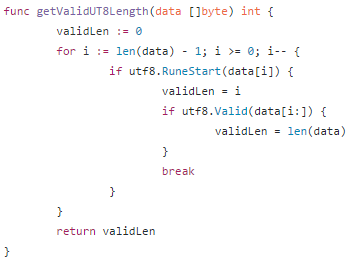 为了保证每次发送的数据都符合 UTF-8 编码规则,Entry 使用如下算法计算一个字节数组中,最长的合法 UTF-8 编码的前缀位置。