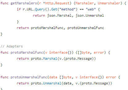 由于服务端需要处理两种不同客户端的请求,因此我们将序列化和反序列化的逻辑抽象出来,定义了自己的序列化,反序列化的函数类型。Go 语言中 json 天生就满足该类型。