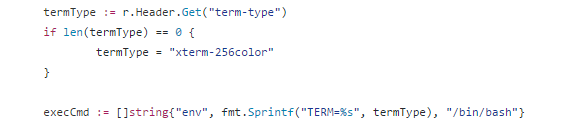 在参数中,设置 AttachStdout,AttachStderr,AttachStdin 和 Tty 均为 true ,即我们需要打开终端并且获得其输入输出流。cmd 参数则设置为我们经常使用的 “docker exec -it xxx bash” 后面的 bash 进程。由于 Docker 自带的终端类型(dumb)太挫,这里在执行 bash 命令时设置临时环境变量 TERM=xterm-256 以提升使用体验。