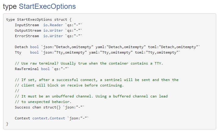 CreateExec 执行成功后,会产生对应的 ExecID 。参数中还需要给 stdOut/stdErr 和 stdIn 分别传入 writer 和 reader 用来写入或读取。而我们则需要从另一边读到或写入数据,这就像是管道的两端。
