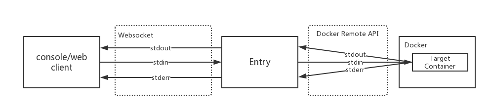 其中,Entry 的服务端负责和 Docker 进程通信,获取容器内终端的输出并发送用户输入到终端。Entry 的服务端还负责对用户鉴权、接收用户来自终端的输入并将容器终端的输出返回给用户。