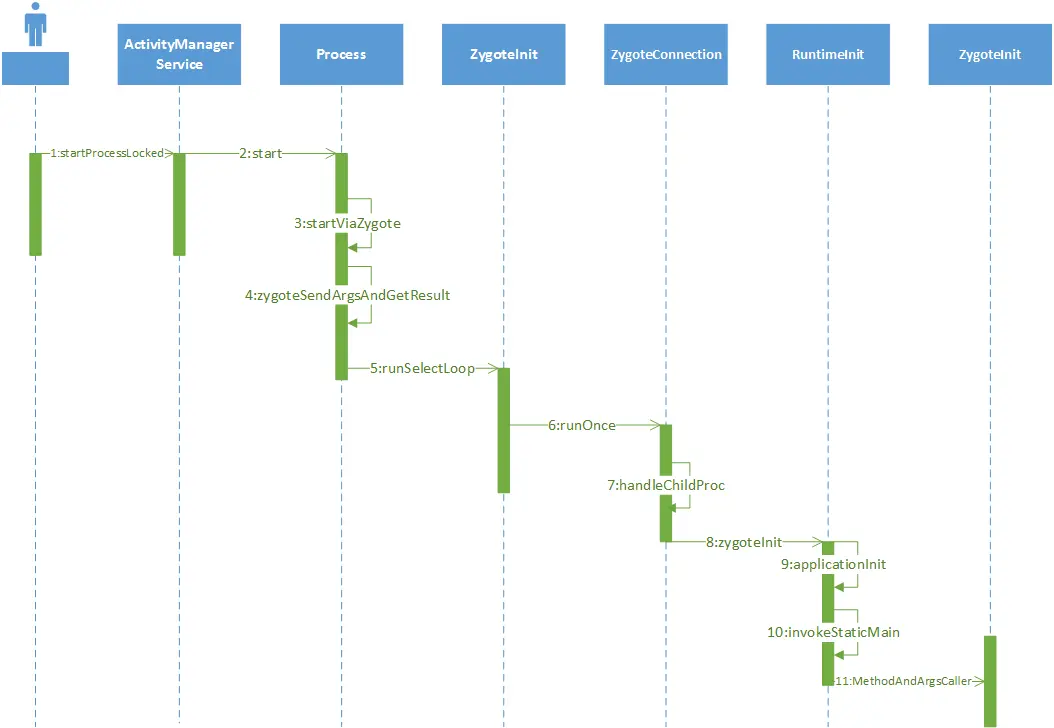 }可以看到注释1处通过反射来获得android.app.ActivityThread类,接下来在注释2处来获得ActivityThread的main函数,并将main函数传入到注释3处的ZygoteInit中的MethodAndArgsCaller类的构造函数中,MethodAndArgsCaller类内部会通过反射调用ActivityThread的main函数,这样应用程序进程就创建完成了。