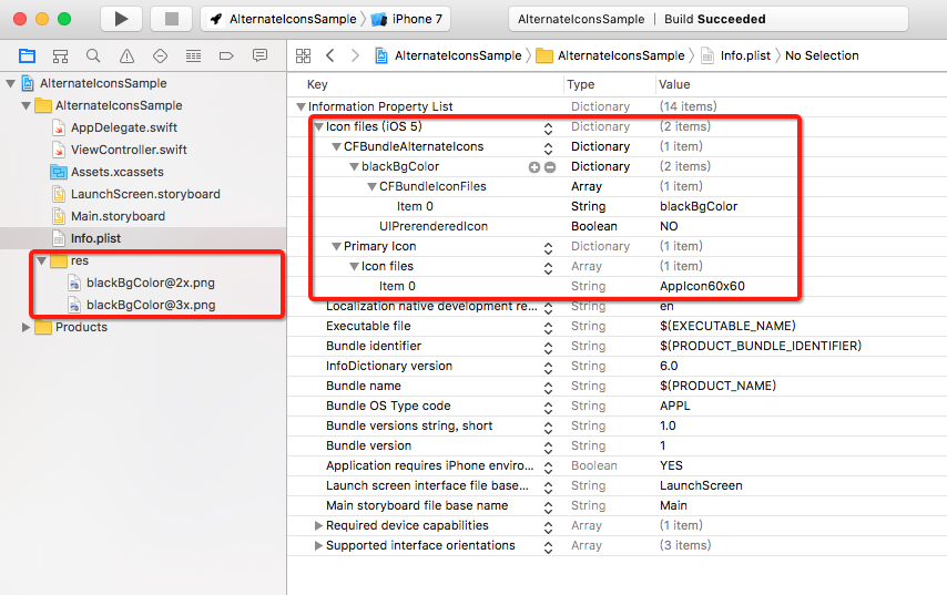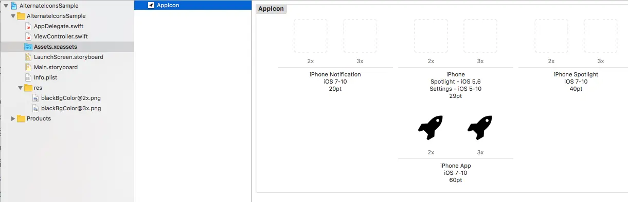 blackBgColor 是我的用于替换原生图标的图片资源。文件名需要和 info.plist 中保持一致(注意 info.plist 中用到了两次 "blackBgColor"),同时这也是你在代码中设置图标时,需要给 API 传入的参数。同样是 60pt@2x 和 60pt@3x 的图片资源,文件不通过 Assets.xcassets 添加进来,而是直接放到目录中。