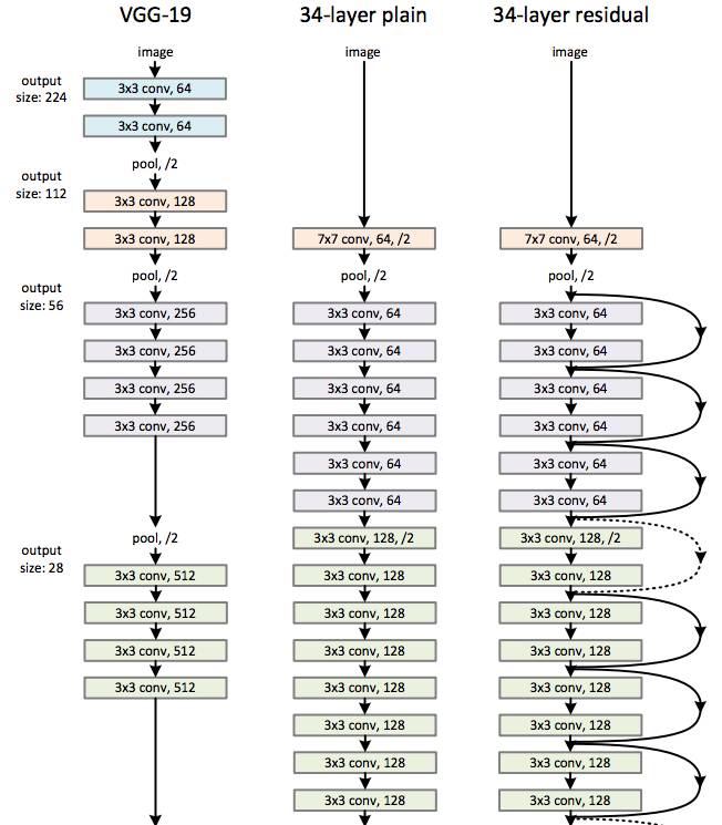 图15 VGG-19,直连的34层网络,ResNet的34层网络的结构对比