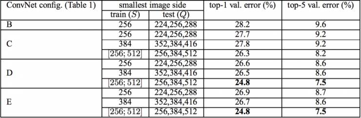 VGGNet在训练时有一个小技巧,先训练级别A的简单网络,再复用A网络的权重来初始化后面的几个复杂模型,这样训练收敛的速度更快。在预测时,VGG采用Multi-Scale的方法,将图像scale到一个尺寸Q,并将图片输入卷积网络计算。然后在最后一个卷积层使用滑窗的方式进行分类预测,将不同窗口的分类结果平均,再将不同尺寸Q的结果平均得到最后结果,这样可提高图片数据的利用率并提升预测准确率。同时在训练中,VGGNet还使用了Multi-Scale的方法做数据增强,将原始图像缩放到不同尺寸S,然后再随机裁切224´224的图片,这样能增加很多数据量,对于防止模型过拟合有很不错的效果。实践中,作者令S在[256,512]这个区间内取值,使用Multi-Scale获得多个版本的数据,并将多个版本的数据合在一起进行训练。图9所示为VGGNet使用Multi-Scale训练时得到的结果,可以看到D和E都可以达到7.5%的错误率。最终提交到ILSVRC 2014的版本是仅使用Single-Scale的6个不同等级的网络与Multi-Scale的D网络的融合,达到了7.3%的错误率。不过比赛结束后作者发现只融合Multi-Scale的D和E可以达到更好的效果,错误率达到7.0%,再使用其他优化策略最终错误率可达到6.8%左右,非常接近同年的冠军Google Inceptin Net。同时,作者在对比各级网络时总结出了以下几个观点。