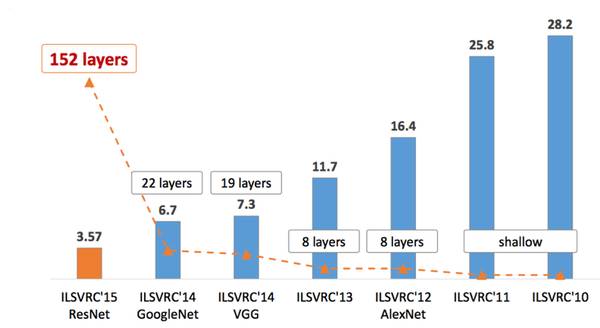 图1 历届ILSVRC比赛代表性模型的成绩及其神经网络深度