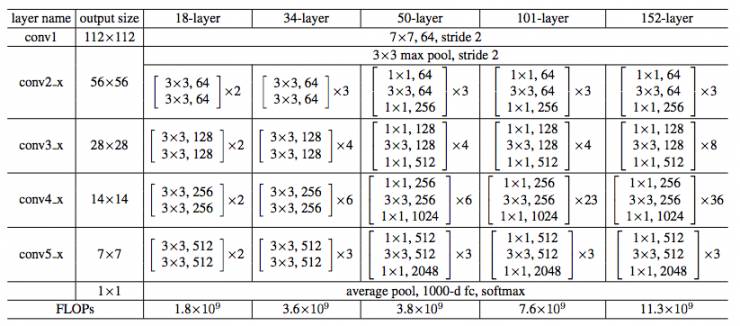 图17 ResNet不同层数时的网络配置