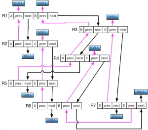 上图中 B 节点的 prev 和 next 我们就能看到在这个链表中,B 有时候是 start node 有时候是 end node。