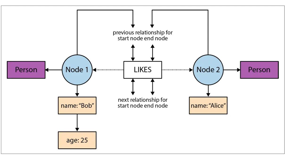 在 neo4j 中任意的关系都有一个 start node 和一个 end node,而且 start node 和 end node 都会有个关联的双向链表,这个双向链表中就记录了从该节点出去和进入的所有关系,一个实例是: