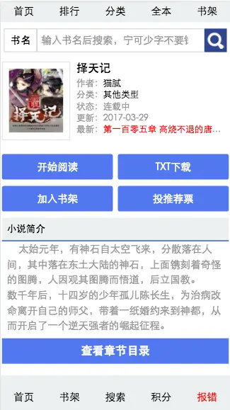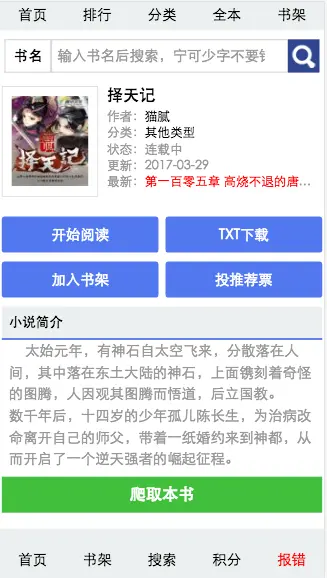 由于我们爬取的手机版网站,打开顶点小说主页 m.23us.com/ ,为了简单起见,我们在进入具体小说的目录页后就开始爬取。下面以《择天记》为例: