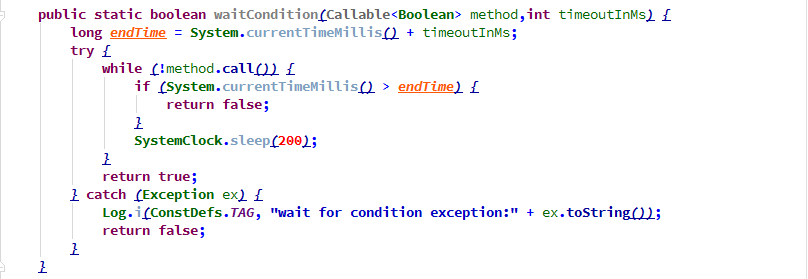 有时候会遇到以下场景,虽然原生的自动化工具提供了等待元素可见的方法,但使用起来,还是无法真正等到元素可见。针对这个问题,如下图的waitCondition方法是一个不错的方案,它相对于thread.sleep来说,更节省时间。