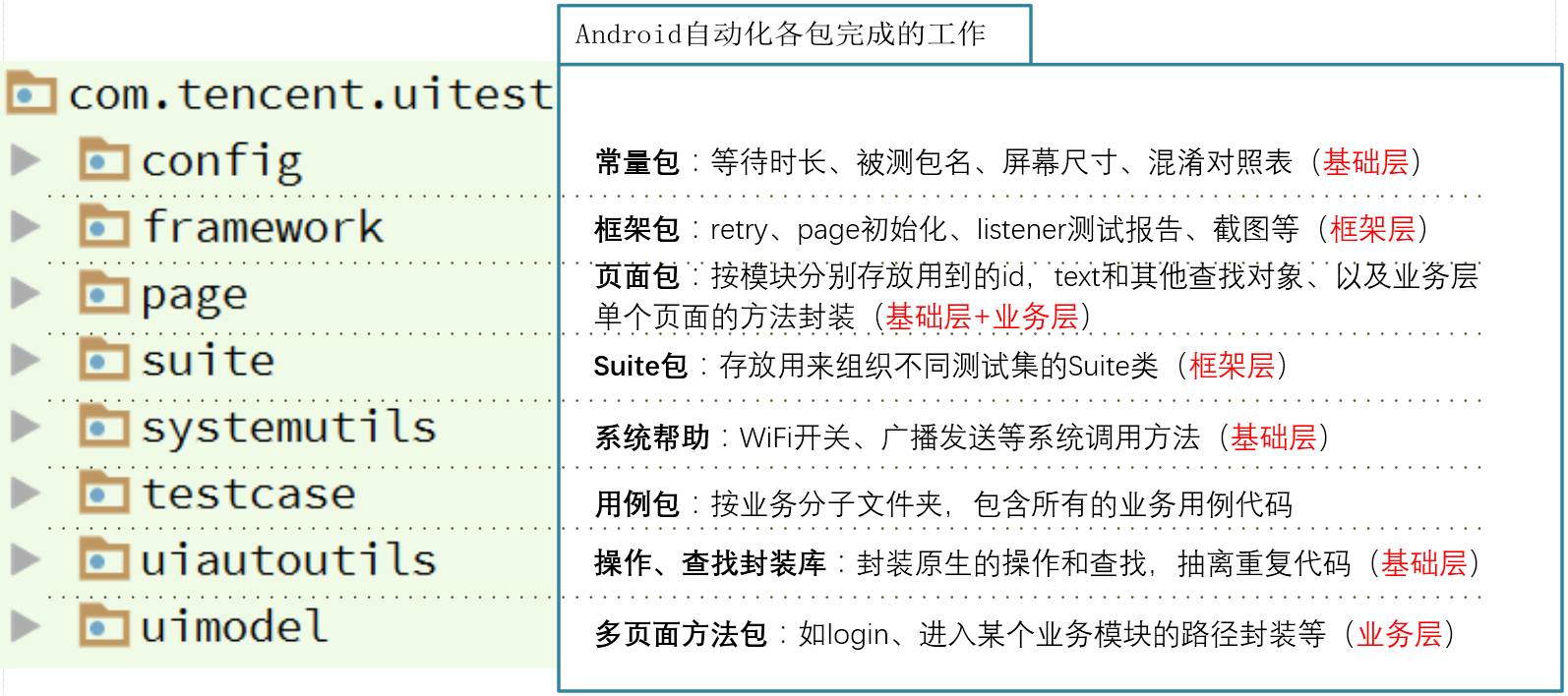 这类问题,我们需要从根上治。UI自动化开发,也应该是严谨的开发工作,它也需要设计模式,也是磨刀不误砍柴工。这里的设计,主要包括选工具、框架分层等。很多前辈都分析过UI自动化各类工具的优缺点,对工具选用笔者不再赘述。主要依托uiautomator来介绍下笔者认为比较巧妙的用例框架设计。