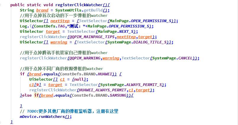 将所有的watcher分不同的手机厂商进行注册后,再调用runWatchers(),然后再执行用例。该方法可以在@BeforeClass中或者RunListener的testRunStarted中调用。当然,如果某个用例不想某个具体的弹框被watcher点击掉,也可以调用removeWatcher()反注册。
