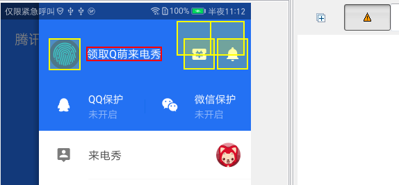 1)、找到相邻控件坐标,计算当前控件的绝对坐标。如下图十四,uiautomatorviewer中点击右上角警告小三角,会得到有一些元素(黄色控件),是可能无法找到的。而使用相对坐标就是说,我们可以获取它相邻控件的坐标,然后减去或加上一个比较小的px值,再点击计算后的坐标即可。