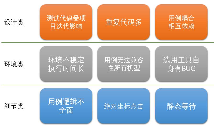 笔者将以上所有的问题简单分成三类:设计类、环境类、细节类。一个好的设计模式,能够避免一部分问题;一套好的环境,可以让我们从乏味的维护工作中解脱;精益求精的细节,让测试用例更加可靠稳定。