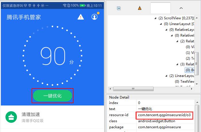 如图七,在手机管家的发布包中,用uiautomatorviewer dump下来发现,一键优化的button,其resource-id是o3,但其实开发coding时,定义的id显然不会用这种没有任何字面意义的代号,它在混淆之前叫optimize_button。