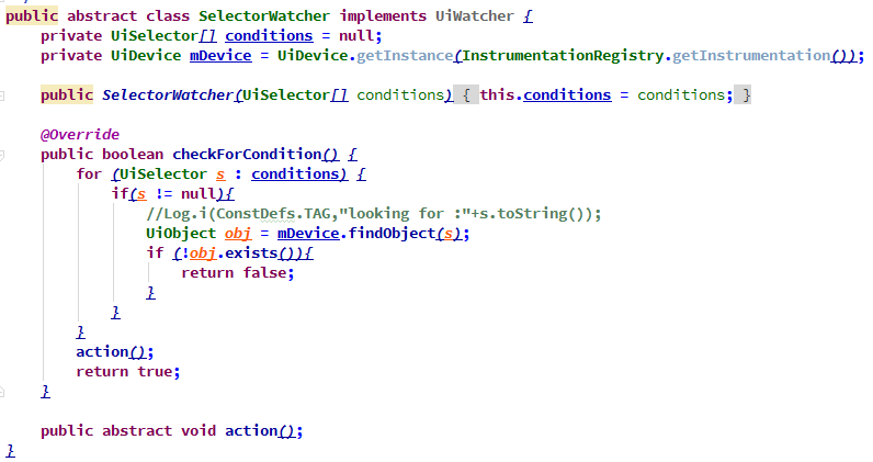uiautomator的watcher,能够完全实现点击弹框和用例逻辑的解耦。当前笔者的实现逻辑是,监听弹框上的某个控件,当该控件出现时,执行action来点击掉其中的取消或确定按钮。这样,用例就只需关注业务逻辑,而任何时候的弹框,都由watcher来自动点击。如下图中,checkForCondition关注条件,action是操作。
