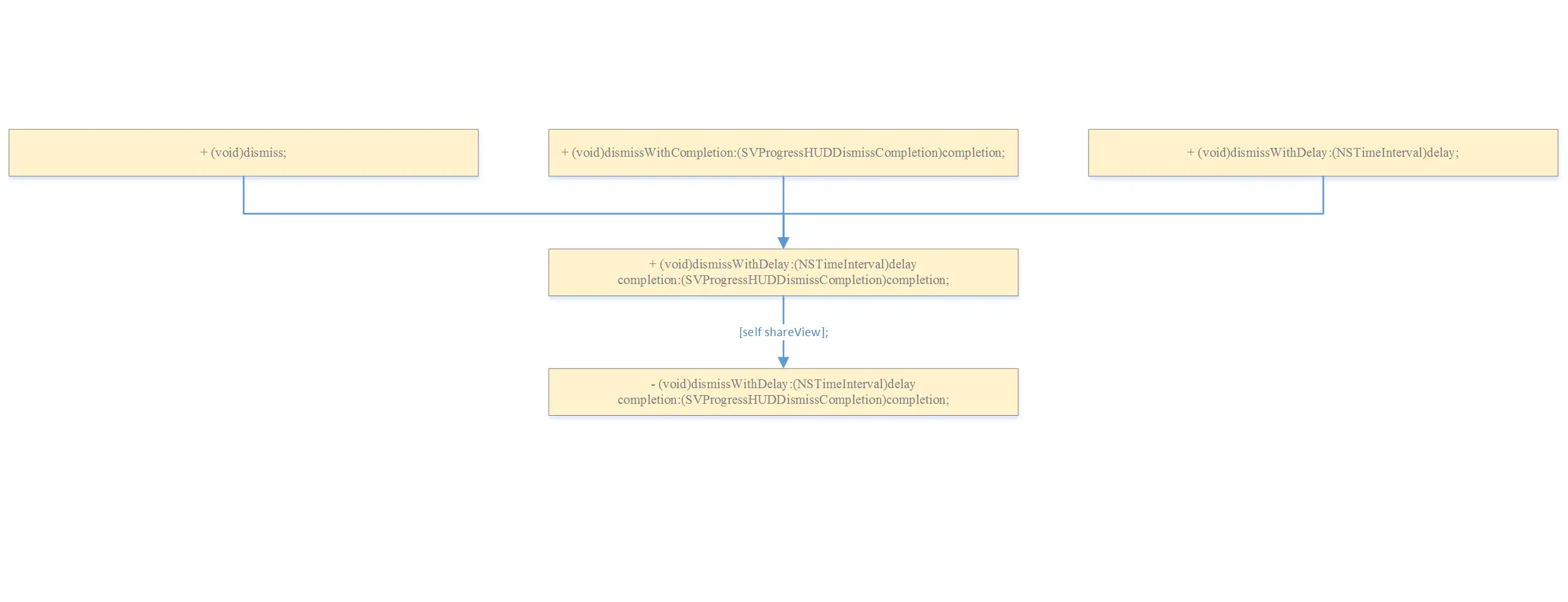 SVProgressHUD中提供如下几种用于隐藏的方法, 他们的调用流程如下图所示