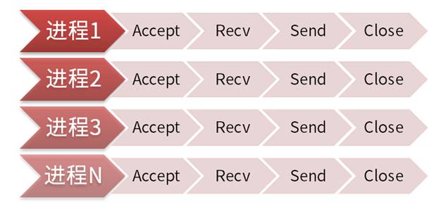 每到达一个请求,Apache都会去fork一个子进程去处理这个请求,直到这个请求处理完毕。